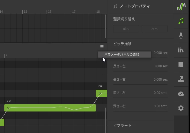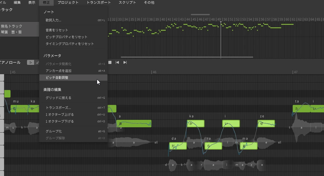 任意のノートを選択したあと、上部ツールバーの「修正」→「パラメータ」→「ピッチ自動調整」をクリックすると、各音源に割り当てられた方式でピッチが自動的に調整されます。