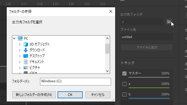 出力先フォルダにフォルダのルートを直接入力(コピペ)するか、右側にあるファイル名をクリックすることで音声を書き出す場所を選択することができます