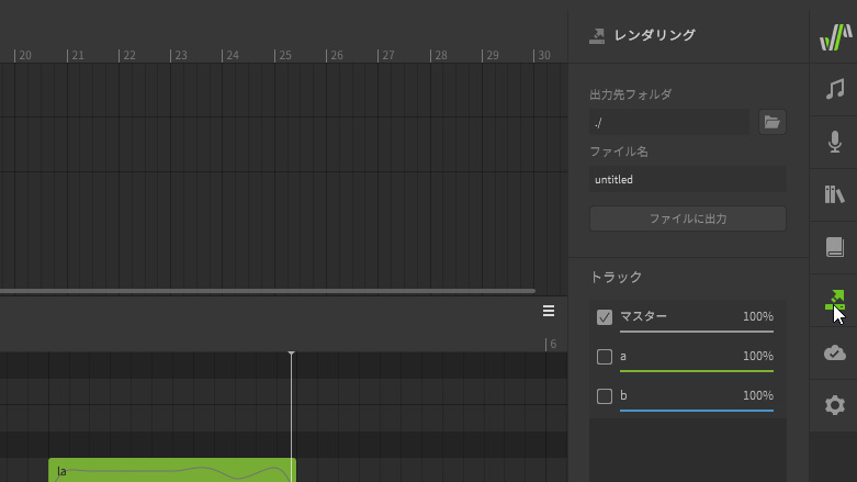 SynthV Studio右端のに並んだアイコンの中で、以下の緑色にハイライトされた「↗」マークをクリックすると、レンダリングタブが表示され、音声の書き出しに関するオプションを選択することができます。